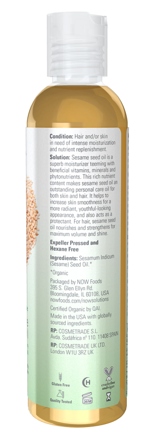Solution: Sesame seed oil is a superb moisturizer teeming with beneficial vitamins, minerals and phytonutrients. This rich nutrient content makes sesame seed oil an outstanding personal care oil for both skin and hair. It helps to increase skin smoothness for a more radiant, youthful-looking appearance, and also acts as a protectant. For hair, sesame seed oil nourishes and strengthens for maximum volume and shine.
