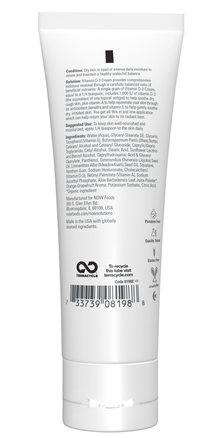 Solution: Vitamin D-3 Cream provides comprehensive moisture renewal through a carefully balanced ratio of beneficial nutrients. A single gram of Vitamin D-3 Cream, equal to a 1/4 teaspoon, includes 1,000 IU of vitamin D-3 (the equivalent of one typical softgel) to help soothe dry, rough skin, plus vitamin A to help rejuvenate your skin through its antioxidant benefits and vitamin E to help gently soothe dry, irritated skin. You get all this in just one application which can help return your skin to its radiant best.