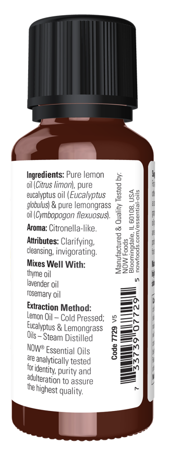 Ingredients:  Pure lemon oil (Citrus limon), pure eucalyptus oil (Eucalyptus globulus) & pure lemongrass oil (Cymbopogon flexuosus).
