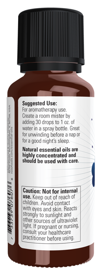 For aromatherapy use. Create a room mister by adding 30 drops to 1 oz. of water in a spray bottle. Great for unwinding before a nap or for a good night’s sleep.