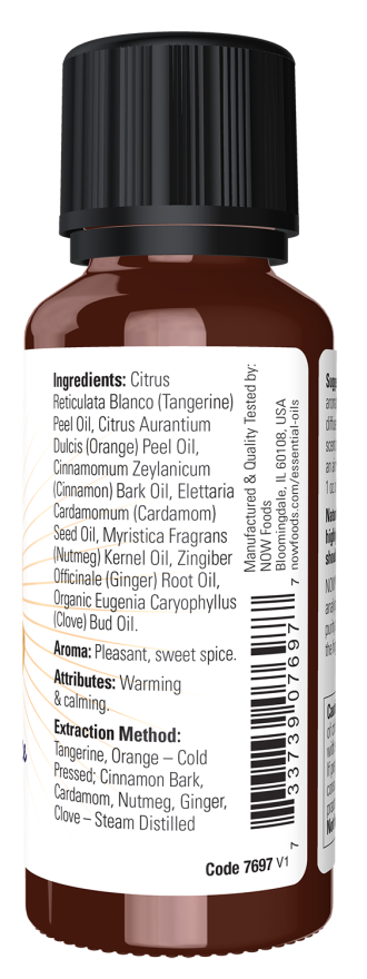 Ingredients: Citrus Reticulata Blanco (Tangerine) Peel Oil, Citrus Aurantium Dulcis (Orange) Peel Oil, Cinnamomum Zeylanicum (Cinnamon) Bark Oil, Elettaria Cardamomum (Cardamom) Seed Oil, Myristica Fragrans (Nutmeg) Kernel Oil, Zingiber Officinale (Ginger) Root Oil, Organic Eugenia Caryophyllus (Clove) Bud Oil.