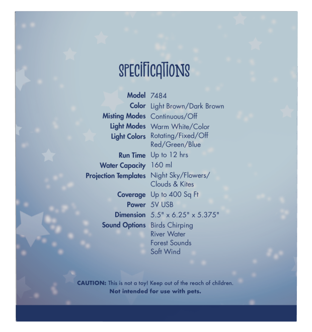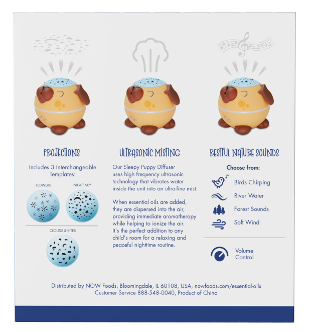 With NOW® Solutions' Sleepy Puppy Diffuser you can send your little ones off to sleep with the soothing sights, sounds and scents of nature. This BPA-free diffuser doesn't utilize heat, so there's no risk of burns. All you need is tap water and your favorite essential oils to create a soothing environment that's ideal for a good night's sleep. With three projection templates, ultrasonic misting and restful nature sounds, our Sleepy Puppy Diffuser will make bedtime something the kids will actually look forward to!