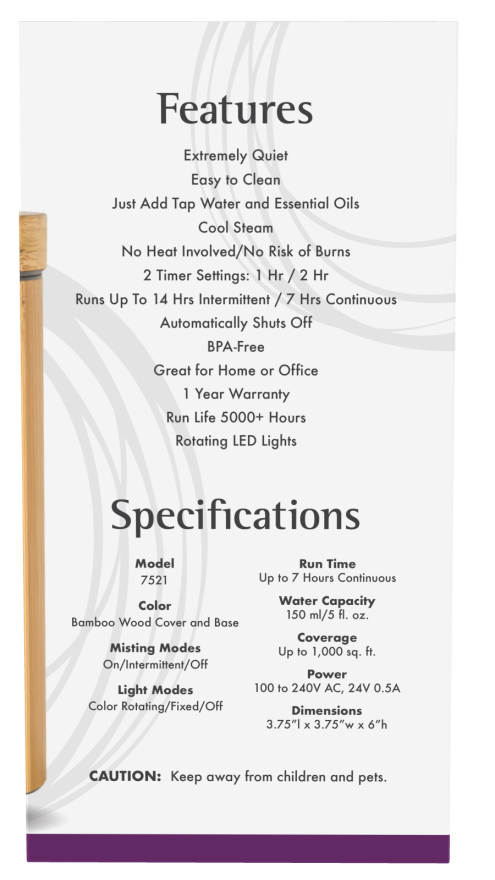 Just add 150 ml (5 fl. oz.) of water and 5 drops of your favorite essential oils and enjoy. Choose your desired time: 1 Hr or 2 Hr, then your mode: intermittent or continuous. It diffuses up to 7 hours on continuous or 14 on intermittent, then shuts off automatically.