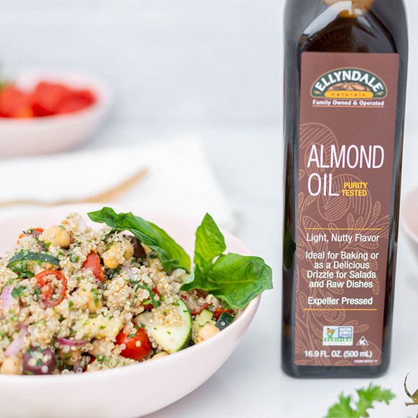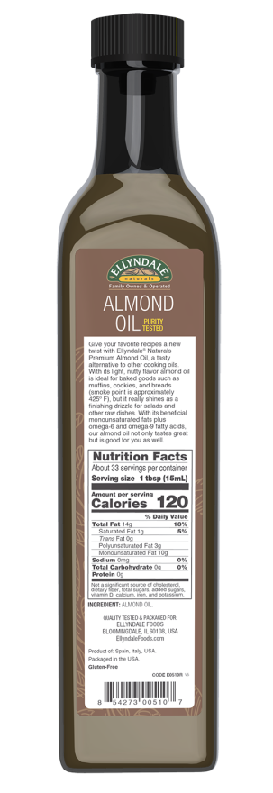 Give your favorite recipes a new twist with Ellyndale® Naturals Premium Almond Oil, a tasty alternative to other cooking oils. With its light, nutty flavor almond oil is ideal for baked goods such as muffins, cookies, and breads (smoke point is approximately 425º F), but it really shines as a finishing drizzle for salads and other raw dishes. With its beneficial monounsaturated fats plus omega-6 and omega-9 fatty acids, our almond oil not only tastes great but is good for you as well.