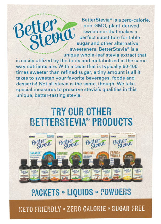 BetterStevia® is a zero-calorie, non-GMO, plant-derived sweetener that makes a perfect substitute for table sugar and other alternative sweeteners. BetterStevia® is a unique whole-leaf stevia extract that is easily utilized by the body and metabolized in the same way nutrients are. With a taste that is typically 60-100 times sweeter than refined sugar, a tiny amount is all it takes to sweeten your favorite beverages, foods and desserts! Not all stevia is the same, though. We take special measures to preserve stevia’s qualities in this unique, better-tasting stevia..