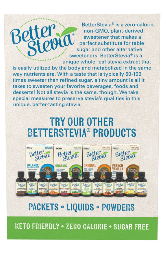 BetterStevia® is a zero-calorie, non-GMO, plant-derived sweetener that makes a perfect substitute for table sugar and other alternative sweeteners. BetterStevia® is a unique whole-leaf stevia extract that is easily utilized by the body and metabolized in the same way nutrients are. With a taste that is typically 60-100 times sweeter than refined sugar, a tiny amount is all it takes to sweeten your favorite beverages, foods and desserts! Not all stevia is the same, though. We take special measures to preserve stevia’s qualities in this unique, better-tasting stevia.