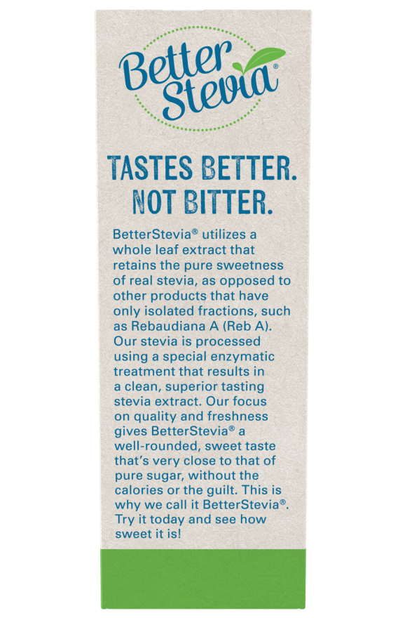 BetterStevia® utilizes a whole leaf extract that retains the pure sweetness of real stevia, as opposed to other products that have only isolated fractions, such as Rebaudiana A (Reb A). Our stevia is processed using a special enzymatic treatment that results in a clean, superior tasting stevia extract. Our focus on quality and freshness gives BetterStevia® a well-rounded, sweet taste that’s very close to that of pure sugar, without the calories or the guilt. This is why we call it BetterStevia®. Try it today and see how sweet it is!