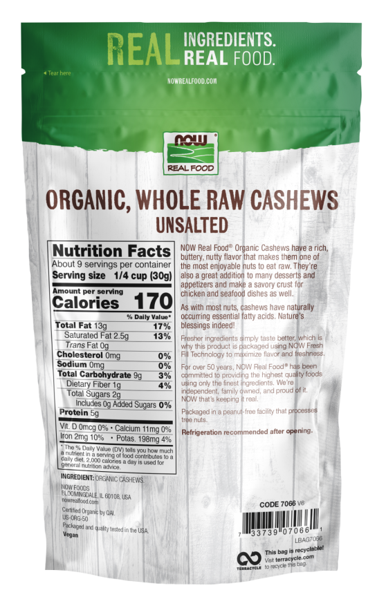 NOW Real Food® Organic Cashews have a rich, buttery, nutty flavor that makes them one of the most enjoyable nuts to eat raw. They're also a great addition to many desserts and appetizers and make a savory crust for chicken and seafood dishes as well.