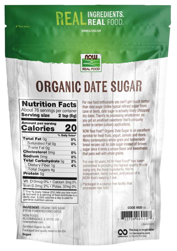 NOW Real Food® Organic Date Sugar is an excellent sprinkle for fresh fruits, yogurt, cereals and more. Many contemporary whole-grain and homemade bread recipes call for date sugar instead of brown sugar since it lends a unique flavor and sweetness that pairs well with whole grains.