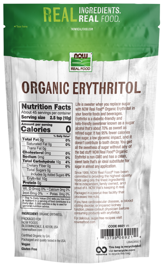 NOW Real Food® Organic Erythritol is non-GMO and has a clean, sweet taste that’s an ideal substitute for sugar in almost any application.