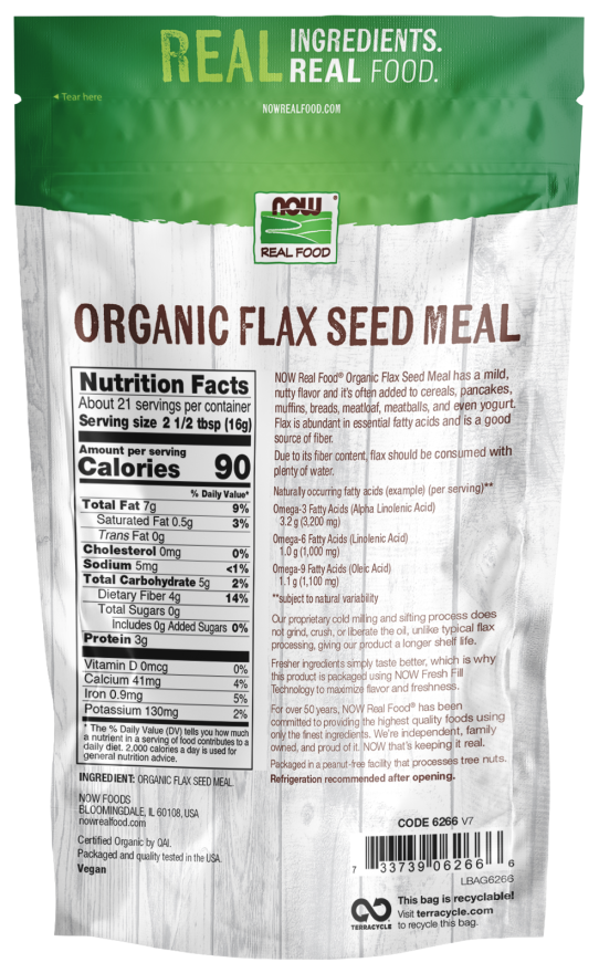 NOW Real Food® Organic Flax Seed Meal has a mild, nutty flavor, and it’s often added to cereals, pancakes, muffins, breads, meatloaf, meatballs, and even yogurt. Flax is abundant in essential fatty acids and is a good source of fiber. Due to its fiber content, flax should be consumed with plenty of water.