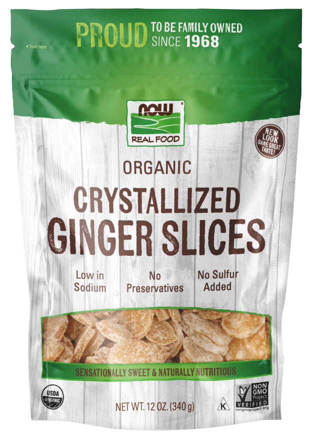 NOW Real Food® Organic Crystallized Ginger Slices contain no added sulfur and are produced from the finest natural ginger rhizomes. They add an exotic flavor to many recipes, and they're perfect for homemade candy-making. Best of all, you can eat them right out of the bag for a serious burst of flavor!