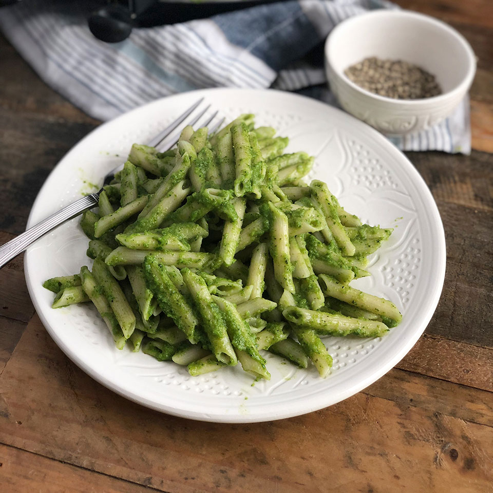 Penne and Nut-Free Vegan Pesto Sauce and Cauliflower