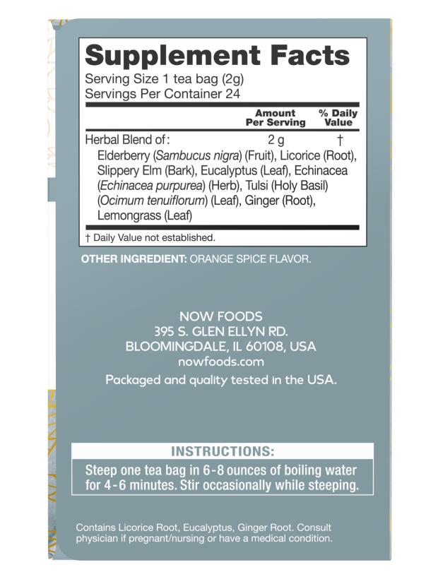 Elderberry (Sambucus nigra) (Fruit), Licorice (Root), Slippery Elm (Bark), Eucalyptus (Leaf), Echinacea (Echinacea purpurea) (Herb), Tulsi (Holy Basil) (Ocimum tenuiflorum) (Leaf), Ginger (Root), Lemongrass (Leaf)