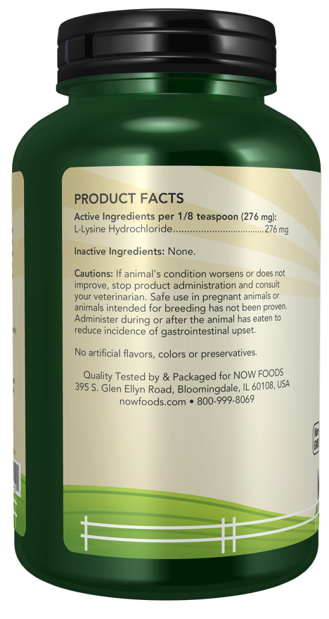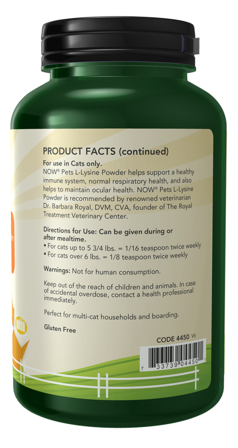 NOW® Pets L-Lysine Powder helps support a healthy immune system, normal respiratory health, and also helps to maintain ocular health. NOW® Pets L-Lysine Powder is a veterinarian recommended health supplement.