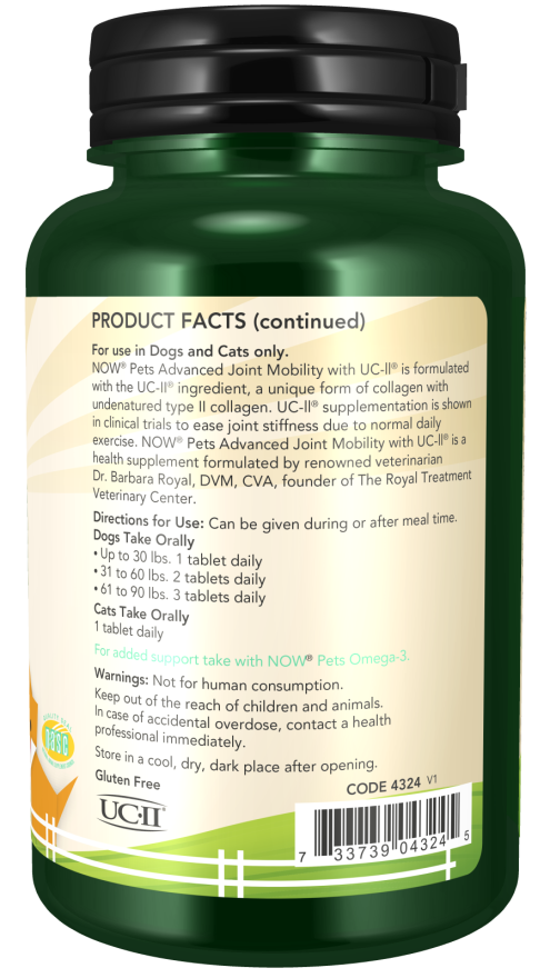 NOW® Pets Advanced Joint Mobility with UC-II® is formulated with the UC-II® ingredient, a unique form of collagen with undenatured type II collagen. UC-II® supplementation is shown in clinical trials to ease joint stiffness due to normal daily exercise. NOW® Pets Advanced Joint Mobility with UC-II® is a veterinarian formulated health supplement.