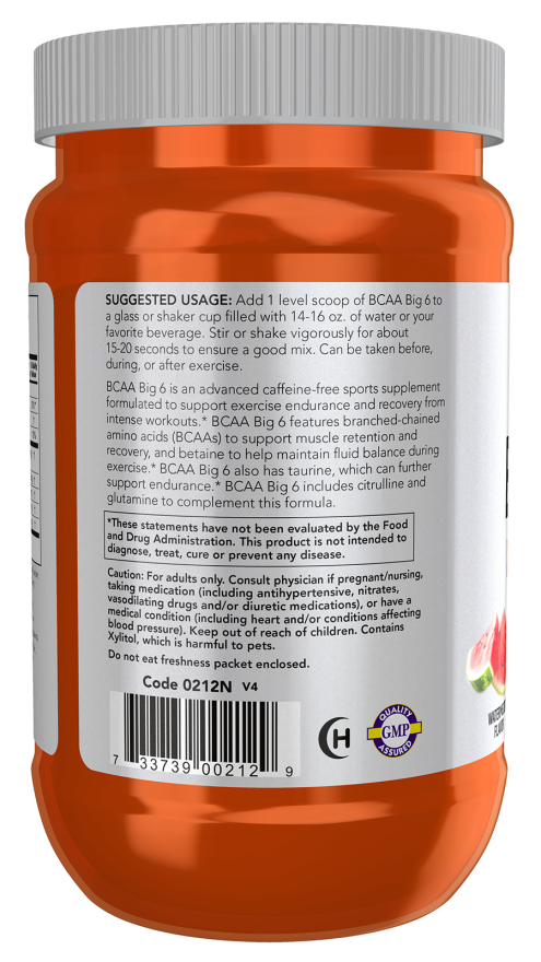 BCAA Big 6 is an advanced caffeine-free sports supplement formulated to support exercise endurance and recovery from intense workouts.* BCAA Big 6 features branched-chained amino acids (BCAAs) to support muscle retention and recovery, and betaine to help maintain fluid balance during exercise.* BCAA Big 6 also has taurine, which can further support endurance.* BCAA Big 6 includes citrulline and glutamine to complement this formula.