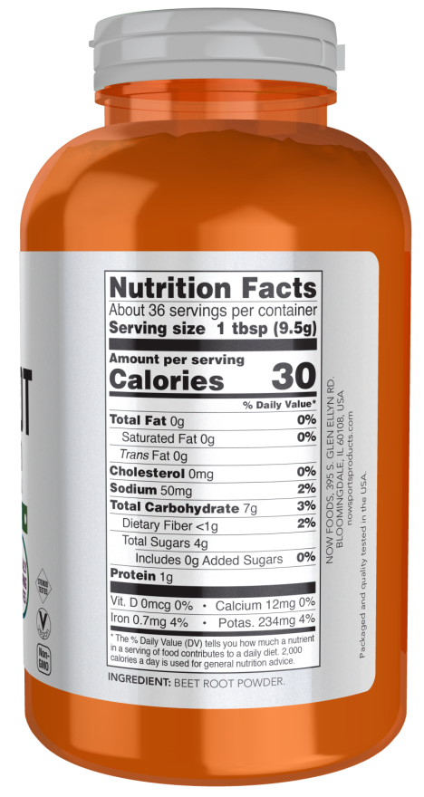 NOW® Sports Beet Root Powder is a pure derivative from non-GMO beets that’s dried and not extracted. Beets are a true superfood and are naturally abundant in a variety of nutrients including nitrates. Each tablespoon serving of NOW® Sports Beet Root Powder is equivalent to 2.5 whole beets.