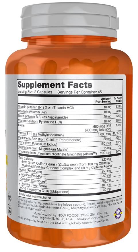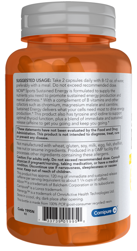 NOW® Sports Sustained Energy is formulated to supply the nutrients you need to promote sustained energy production and mental alertness.* With a complement of B vitamins and other cofactors such as chromium, magnesium malate and carnitine, Sustained Energy delivers what your cells need most to drive energy production.* This product also has tyrosine and iodine to support optimal thyroid function, plus a blend of immediate and sustained release caffeine to get you going and keep you going.*