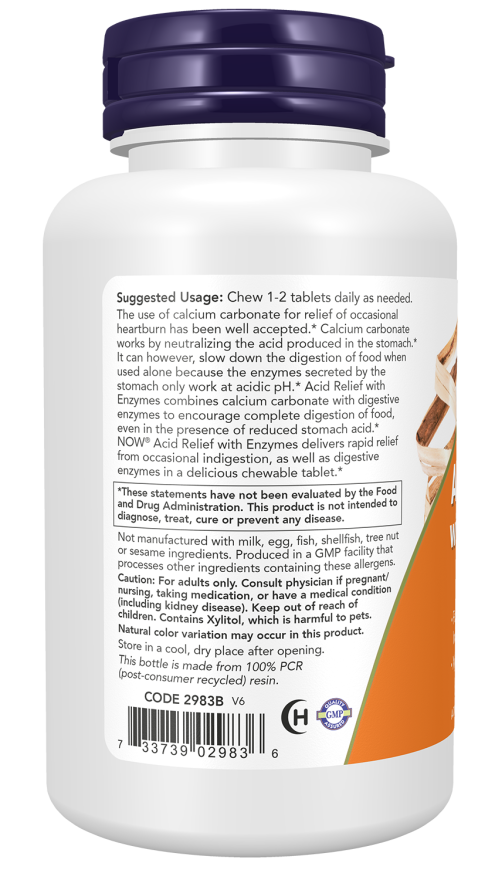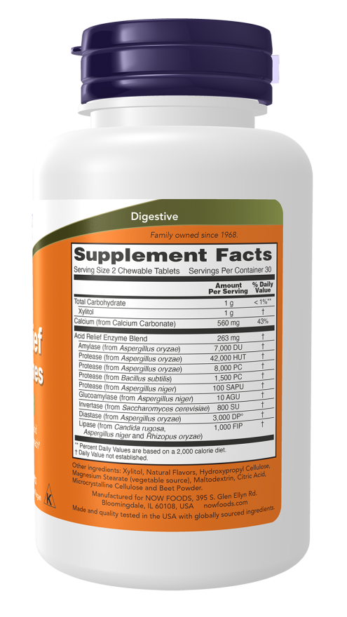 The use of calcium carbonate for relief of occasional heartburn has been well accepted.* Calcium carbonate works by neutralizing the acid produced in the stomach.* It can however, slow down the digestion of food when used alone because the enzymes secreted by the stomach only work at acidic pH.* Acid Relief with Enzymes combines calcium carbonate with digestive enzymes to encourage complete digestion of food, even in the presence of reduced stomach acid.* NOW® Acid Relief with Enzymes delivers rapid relief from occasional indigestion, as well as digestive enzymes in a delicious chewable tablet.*