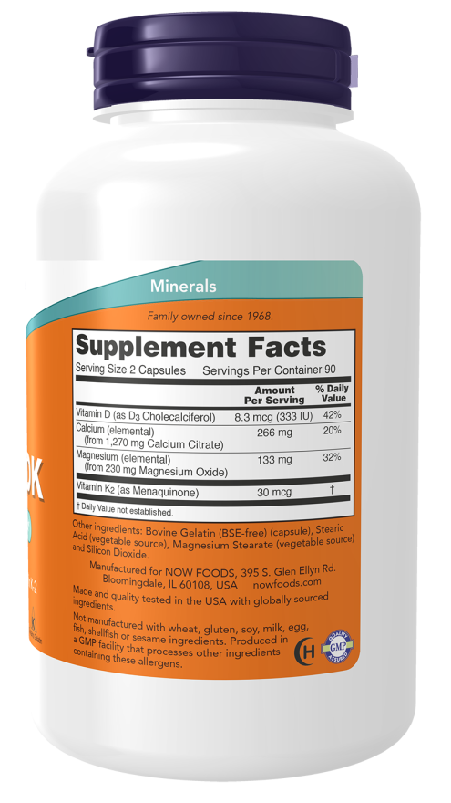Calcium and magnesium are minerals that are known to be essential for bone health.* Along with these two important minerals, NOW® Cal-Mag DK Caps provide vitamins D and K.* Vitamin D3, a fat soluble vitamin, has been shown to play a critical role in bone metabolism, as well as in the absorption of calcium and magnesium in the intestine.* Vitamin K2 is a nutrient that further supports bone health through its participation in healthy bone calcification.*