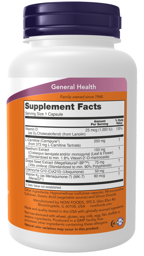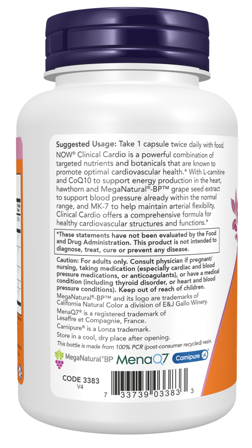 NOW® Clinical Cardio is a powerful combination of targeted nutrients and botanicals that are known to promote optimal cardiovascular health.* With L-carnitine and CoQ10 to support energy production in the heart, hawthorn and MegaNatural®-BP™ grape seed extract to support blood pressure already within the normal range, and MK-7 to help maintain arterial flexibility, Clinical Cardio offers a comprehensive formula for healthy cardiovascular structures and functions.*