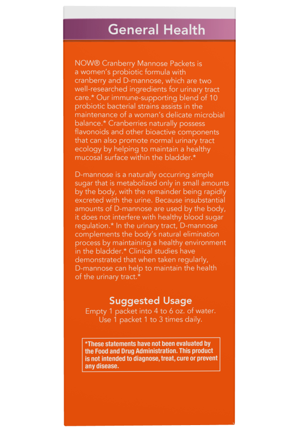 NOW® Cranberry Mannose Packets is a women’s probiotic formula with cranberry and D-mannose, which are two well-researched ingredients for urinary tract care.* Our immune-supporting blend of 10 probiotic bacterial strains assists in the maintenance of a woman’s delicate microbial balance.* Cranberries naturally possess flavonoids and other bioactive components that can also promote normal urinary tract ecology by helping to maintain a healthy mucosal surface within the bladder.*