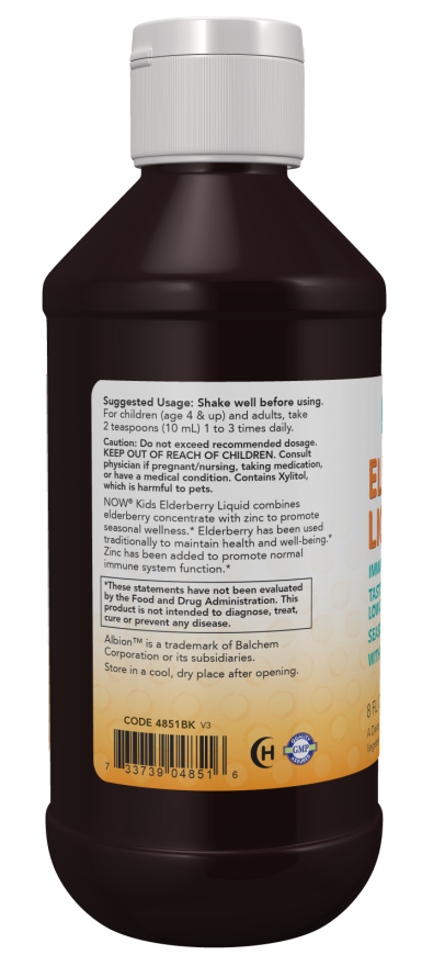 NOW® Kids Elderberry Liquid combines elderberry concentrate with zinc to promote seasonal wellness.* Elderberry has been used traditionally to maintain health and well-being.* Zinc has been added to promote normal immune system function.*