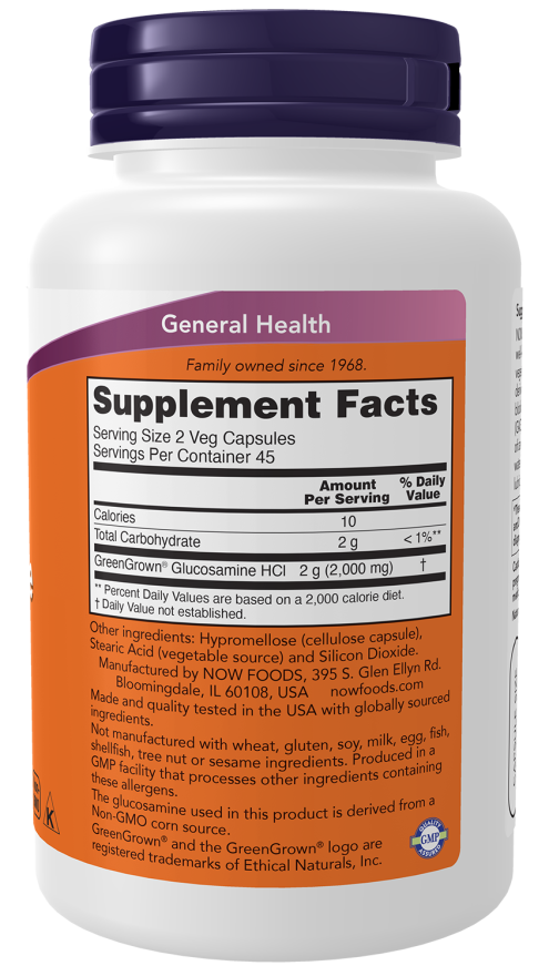 NOW® Vegetarian Glucosamine ‘1000’ is a well-known joint support ingredient that is vegetarian/vegan friendly and not shellfish-derived.* Glucosamine is an essential building block for the formation of glycosaminoglycans (GAGs) and proteoglycans, the main components of cartilage tissue.* These compounds attract water to form a joint cushion, providing lubrication and shock absorption.*