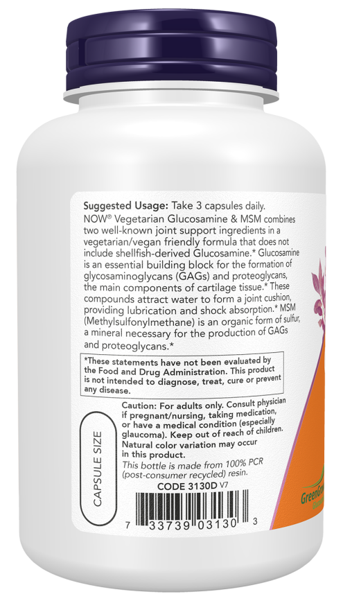 NOW® Vegetarian Glucosamine & MSM combines two well-known joint support ingredients in a vegetarian/vegan friendly formula that does not include shellfish-derived glucosamine.* Glucosamine is an essential building block for the formation of glycosaminoglycans (GAGs) and proteoglycans, the main components of cartilage tissue.* These compounds attract water to form a joint cushion, providing lubrication and shock absorption.* MSM (Methylsulfonylmethane) is an organic form of sulfur, a mineral necessary for the production of GAGs and proteoglycans.*