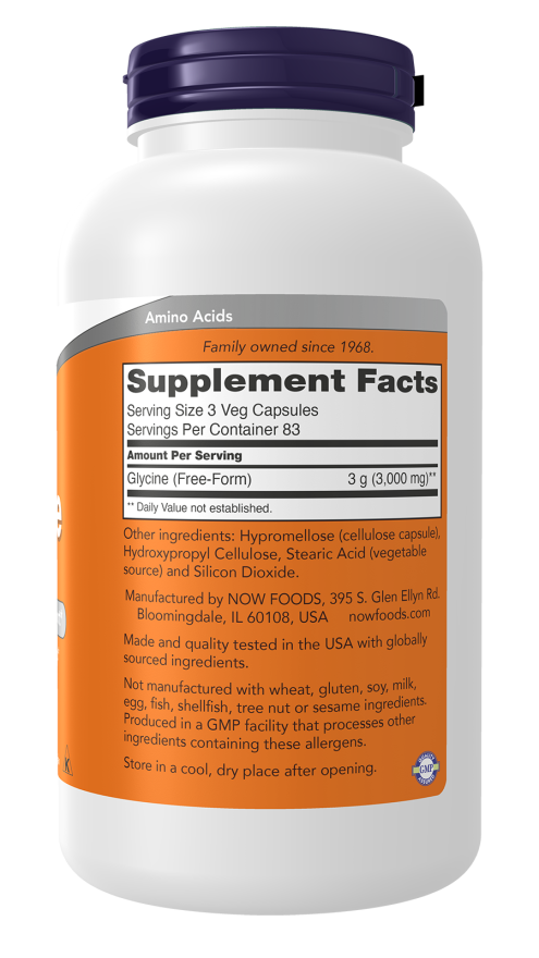 Glycine is the smallest and simplest amino acid, making it versatile for use in a wide range of functions. Glycine is necessary for the production of glutathione, DNA, creatine, bile, hemoglobin, and most proteins.* It also helps to promote glycogen storage, thereby making glucose readily available for energy production.* Glycine also functions as a calming neurotransmitter in the brain, where it facilitates nerve impulses and is important for the maintenance of healthy sleep patterns.*