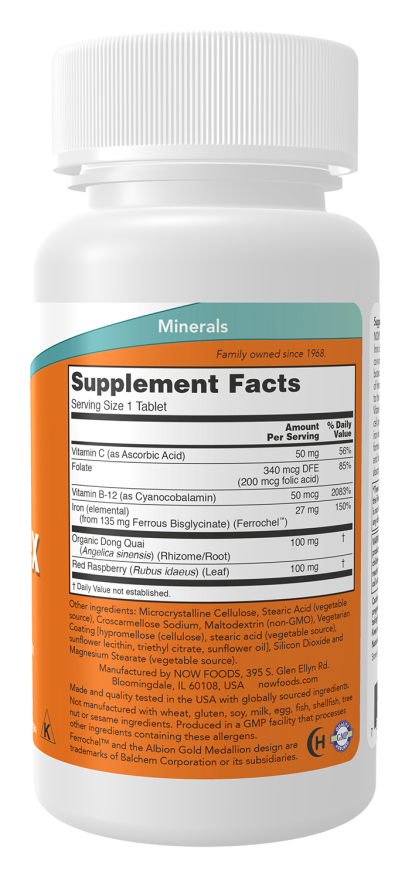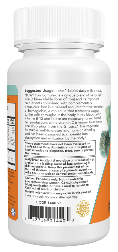 NOW® Iron Complex is a unique blend of Ferrochel™ Iron (a bioavailable form of iron) and its important co-nutrients combined with complementary botanicals. Iron is a mineral required for the formation of hemoglobin, a molecule that transports oxygen to the cells throughout the body in red blood cells.* Vitamin B-12 and folate are necessary for red blood cell production, while vitamin C is known to enhance iron absorption from the GI tract.* This vegetarian formula is well-tolerated and non-constipating and has been designed to maximize iron absorption and utilization by the body.*