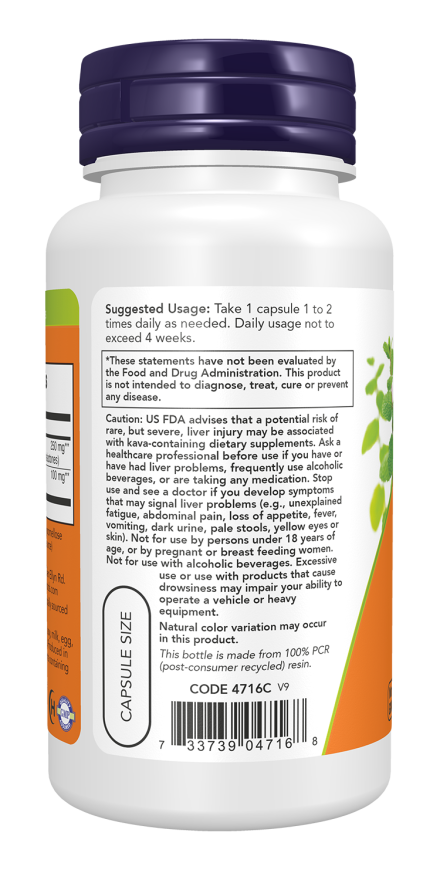 Caution: US FDA advises that a potential risk of rare, but severe, liver injury may be associated with kava-containing dietary supplements. Ask a healthcare professional before use if you have or have had liver problems, frequently use alcoholic beverages, or are taking any medication. Stop use and see a doctor if you develop symptoms that may signal liver problems (e.g., unexplained fatigue, abdominal pain, loss of appetite, fever, vomiting, dark urine, pale stools, yellow eyes or skin). Not for use by persons under 18 years of age, or by pregnant or breast feeding women. Not for use with alcoholic beverages. Excessive use or use with products that cause drowsiness may impair your ability to operate a vehicle or heavy equipment.