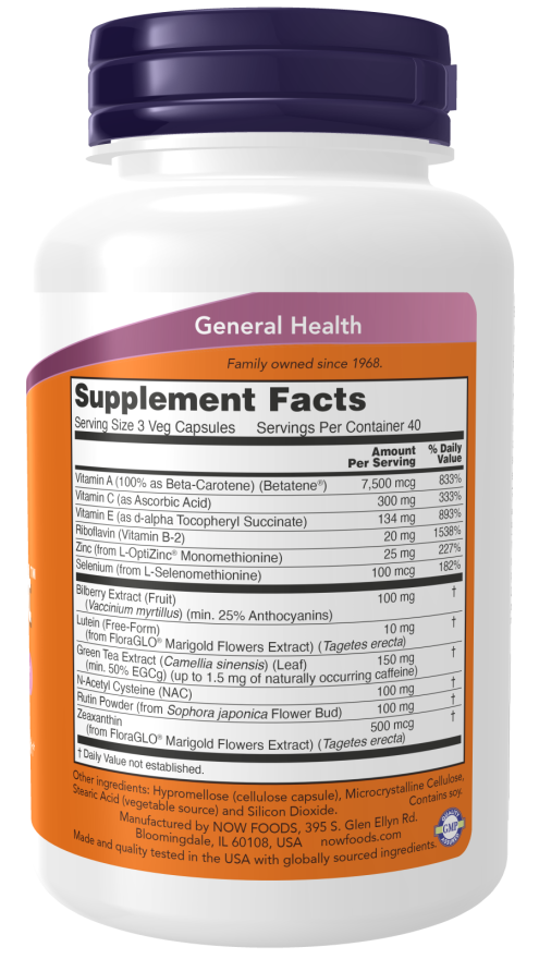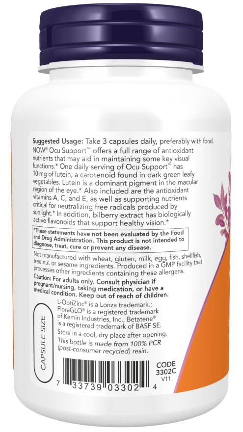 NOW® Ocu Support™ offers a full range of antioxidant nutrients that may aid in maintaining some key visual functions.* One daily serving of Ocu Support™ has 10 mg of lutein, a carotenoid found in dark green leafy vegetables. Lutein is a dominant pigment in the macular region of the eye.* Also included are the antioxidant vitamins A, C, and E, as well as supporting nutrients critical for neutralizing free radicals produced by sunlight.* In addition, bilberry extract has biologically active flavonoids that support healthy vision.*