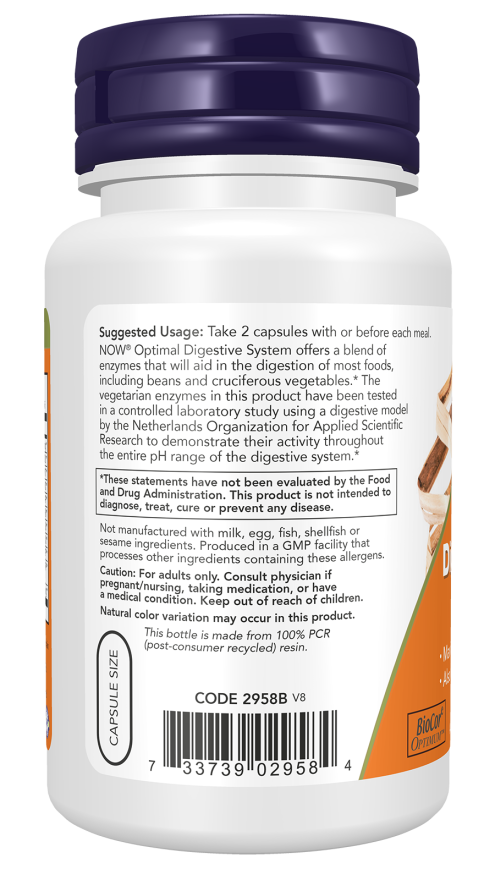 NOW® Optimal Digestive System offers a blend of enzymes that will aid in the digestion of most foods, including beans and cruciferous vegetables.* The vegetarian enzymes in this product have been tested in a controlled laboratory study using a digestive model by the Netherlands Organization for Applied Scientific Research to demonstrate their activity throughout the entire pH range of the digestive system.*