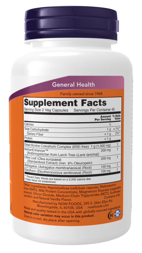NOW® Super Colostrum combines colostrum with the herbal ingredients, larch arabinogalactan, olive leaf and astragalus to maximize immune system support.* Colostrum has naturally occurring immunoglobulins IgG, IgM and IgA, which are important immunological proteins for both animals and humans.*