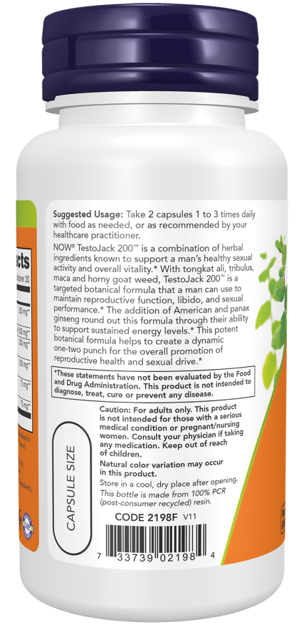 NOW® TestoJack® 200 is a combination of natural herbal ingredients known to support a man's healthy sexual activity and overall vitality.* With tongkat ali, tribulus, maca and horny goat weed, TestoJack® 200 is a targeted botanical formula that a man can use to maintain reproductive function, libido, and sexual performance.* The addition of American and panax ginseng round out this formula through their ability to support sustained energy levels.* This potent botanical formula helps to create a dynamic one-two punch for the overall promotion of reproductive health and sexual drive.*