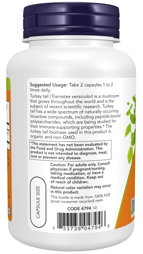 Turkey tail (Trametes versicolor) is a mushroom that grows throughout the world and is the subject of recent scientific research. Turkey tail has a wide spectrum of naturally occurring bioactive compounds, including peptide-bound polysaccharides, which are being studied for their immune-supporting properties.* The turkey tail biomass used in this product is organic and non-GMO.