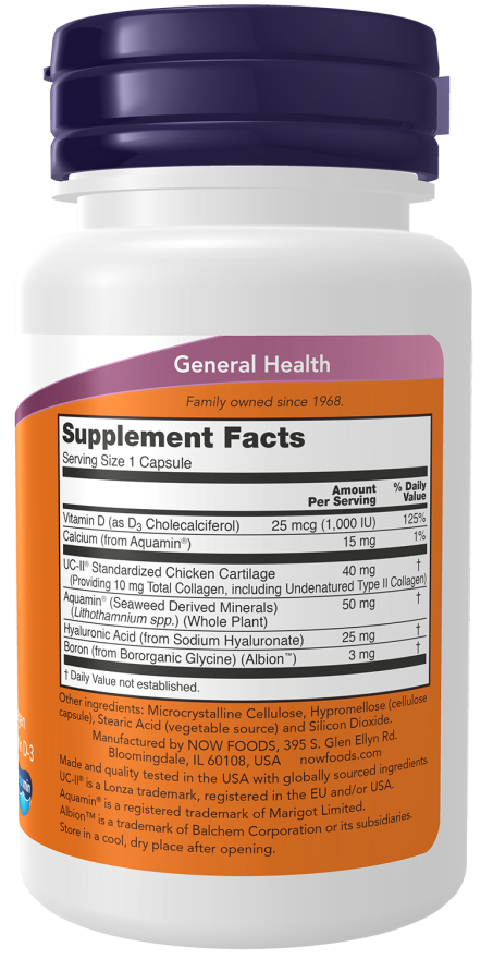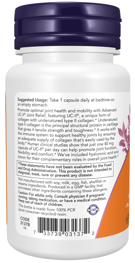 Promote optimal joint health and mobility with Advanced UC-II® Joint Relief, featuring UC-II®, a unique form of collagen with undenatured type II collagen.* Undenatured type II collagen is the principal structural protein in cartilage that gives it tensile strength and toughness.* It works with the immune system to support healthy joints by ensuring an adequate supply of collagen that’s easily used by the body.* Human clinical studies show that just one 40 mg capsule of UC-II® per day can help promote joint function, flexibility and comfort.* We’ve included hyaluronic acid and boron for their complementary roles in overall joint health.*