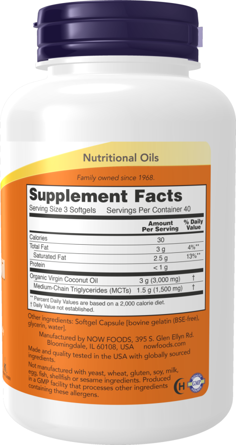 Coconut oil is a traditional dietary staple of the people of Asia, Africa, and the Pacific Islands and has been used in Ayurvedic herbalism for thousands of years. NOW® Virgin Coconut Oil is an unrefined, cold-pressed oil, and does not utilize any solvents in the manufacturing process. Coconut oil is abundant in medium-chain triglycerides (MCTs), such as lauric acid (C12) and caprylic acid (C8). MCTs are less likely to be stored in the body as fat than most other fatty acids.* When combined with essential fatty acids, it is a perfect addition to an overall balanced lipid program.*