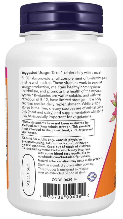 B-100 Tabs provide a full complement of B-vitamins plus choline and inositol. These vitamins work to support energy production, maintain healthy homocysteine metabolism, and promote the health of the nervous system.* B-vitamins are water soluble, and with the exception of B-12, have limited storage in the body and thus require daily replenishment. While B-12 is stored in the liver, dietary sources are of animal origin only (meat and dairy) and supplementation with B-12 may be especially important for vegetarians.