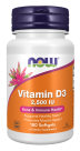 NOW® Vitamin D3 softgels supply this key vitamin in a highly absorbable liquid softgel form. Vitamin D is normally obtained from the diet or produced by the skin from the ultraviolet energy of the sun. However, it is not abundant in food. As more people avoid sun exposure, vitamin D supplementation becomes even more necessary to ensure that your body receives an adequate supply.